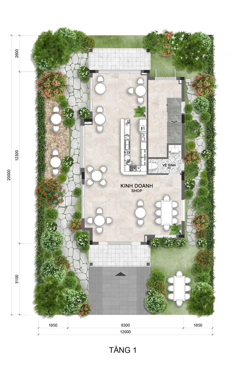 Trung tâm là khu vực kinh doanh rộng rãi, bố trí linh hoạt nhiều bàn ngồi trong nhà và ngoài trời. Quầy pha chế/chuẩn bị đặt ở giữa giúp vận hành thuận tiện, phía sau có khu vệ sinh riêng biệt. Bao quanh công trình là sân vườn và lối dạo hai bên, tạo không gian thoáng đãng, tăng trải nghiệm cho khách và giá trị thẩm mỹ tổng thể.