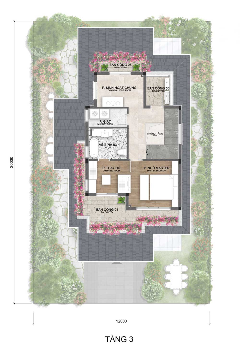 Thiết kế riêng tư với phòng ngủ master rộng rãi, có phòng thay đồ và vệ sinh khép kín. Khu sinh hoạt chung đặt gần thông tầng giúp đón sáng và tạo sự kết nối không gian. Ngoài ra, tầng này còn bố trí phòng giặt tiện lợi cùng nhiều ban công xanh mát, mang lại cảm giác thư giãn và gần gũi thiên nhiên.