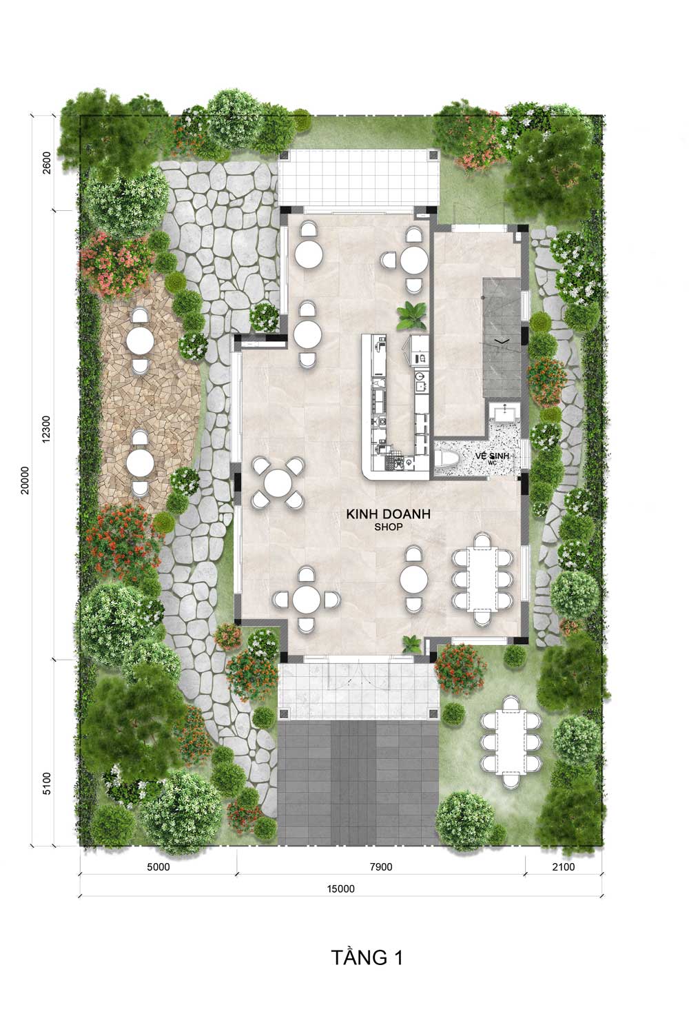 Trung tâm là khu vực kinh doanh rộng rãi, bố trí linh hoạt nhiều bàn ngồi trong nhà và ngoài trời. Quầy pha chế/chuẩn bị đặt ở giữa giúp vận hành thuận tiện, phía sau có khu vệ sinh riêng biệt. Bao quanh công trình là sân vườn và lối dạo hai bên, tạo không gian thoáng đãng, tăng trải nghiệm cho khách và giá trị thẩm mỹ tổng thể.