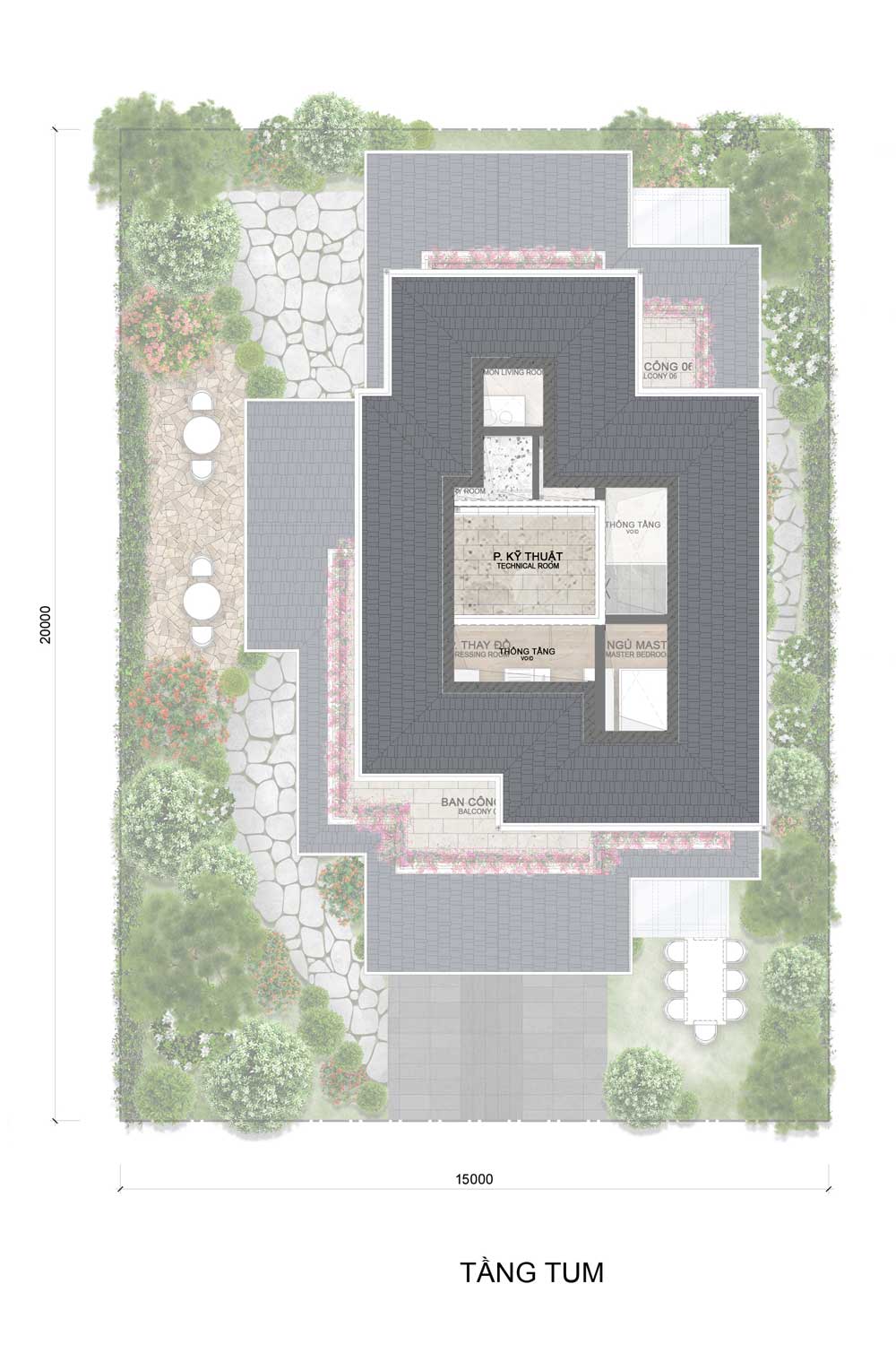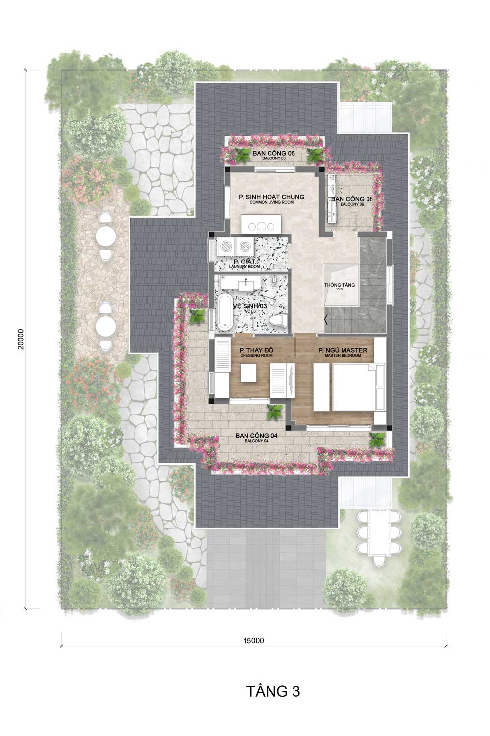 Thiết kế riêng tư với phòng ngủ master rộng rãi, có phòng thay đồ và vệ sinh khép kín. Khu sinh hoạt chung đặt gần thông tầng giúp đón sáng và tạo sự kết nối không gian. Ngoài ra, tầng này còn bố trí phòng giặt tiện lợi cùng nhiều ban công xanh mát, mang lại cảm giác thư giãn và gần gũi thiên nhiên.