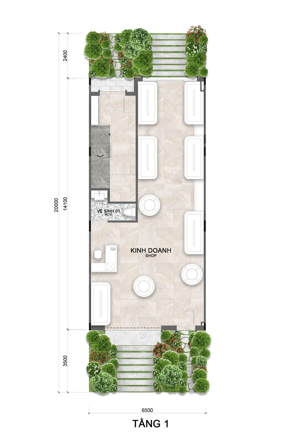 Không gian kinh doanh rộng rãi, bố trí linh hoạt với khu trưng bày và quầy phục vụ. Phía sau có WC và lối thang riêng; mặt trước và sau đều có khoảng sân xanh, tạo sự thông thoáng và thu hút khách.