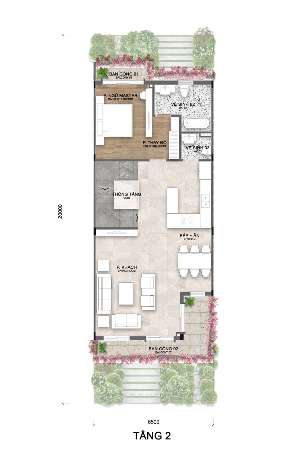 Gồm phòng ngủ master có phòng thay đồ, WC riêng và ban công sau. Khu thông tầng đặt giữa nhà tạo độ thoáng; phía trước là phòng khách kết hợp bếp – ăn, thêm WC phụ và ban công rộng, đảm bảo tiện nghi và đón sáng tự nhiên.