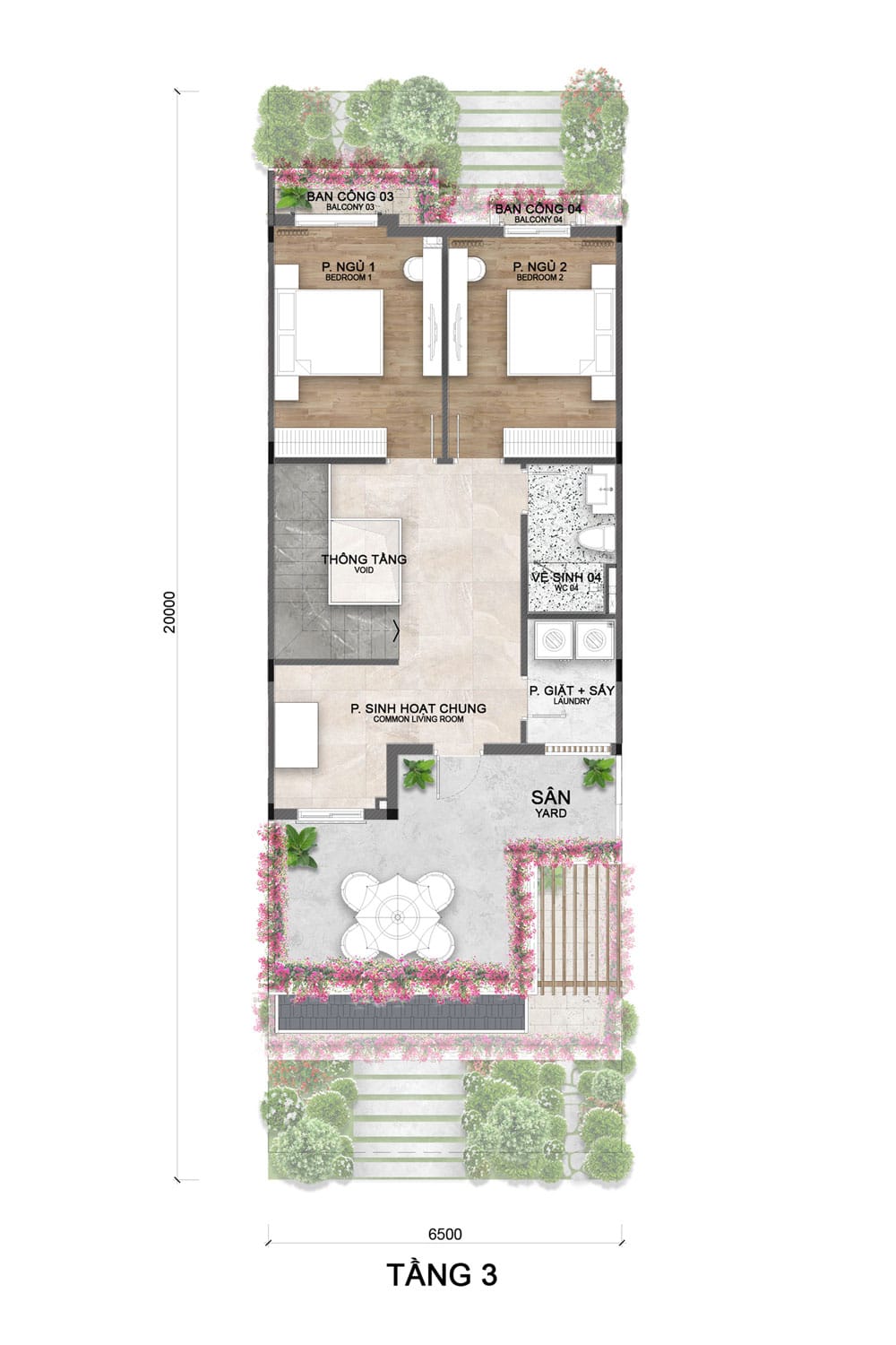 Gồm 2 phòng ngủ phía sau, mỗi phòng có ban công riêng. Ở giữa là khu sinh hoạt chung kết nối thông tầng; phía trước bố trí phòng giặt – sấy, WC và sân rộng, tạo không gian thoáng đãng, tiện nghi cho cả gia đình.