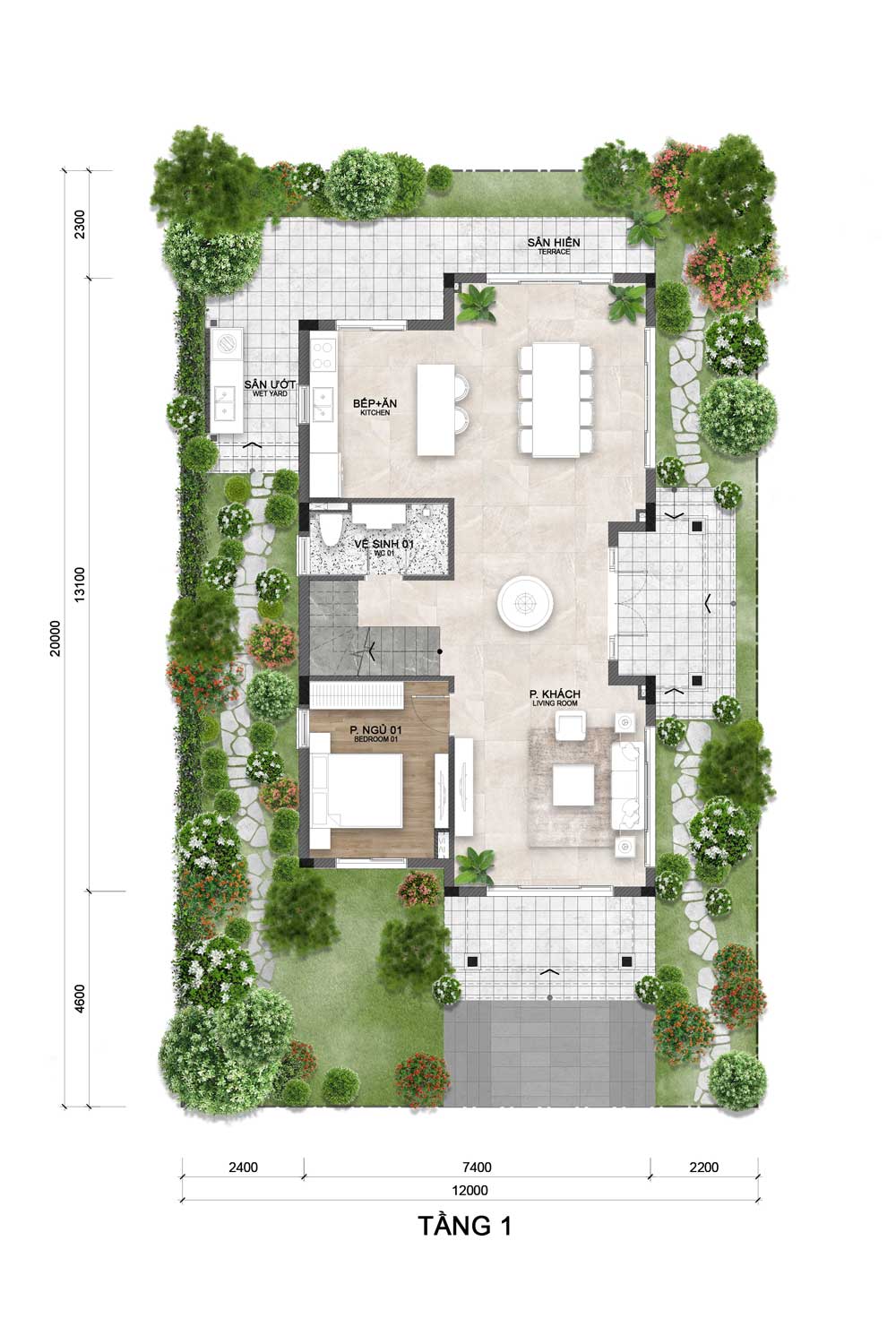 Được thiết kế mở với phòng khách trung tâm kết nối trực tiếp bếp + bàn ăn và sân hiên phía sau. Tầng này có 1 phòng ngủ, 1 vệ sinh chung và khu sân ướt riêng biệt. Không gian bao quanh là sân vườn xanh mát, tạo sự thông thoáng và gần gũi thiên nhiên.