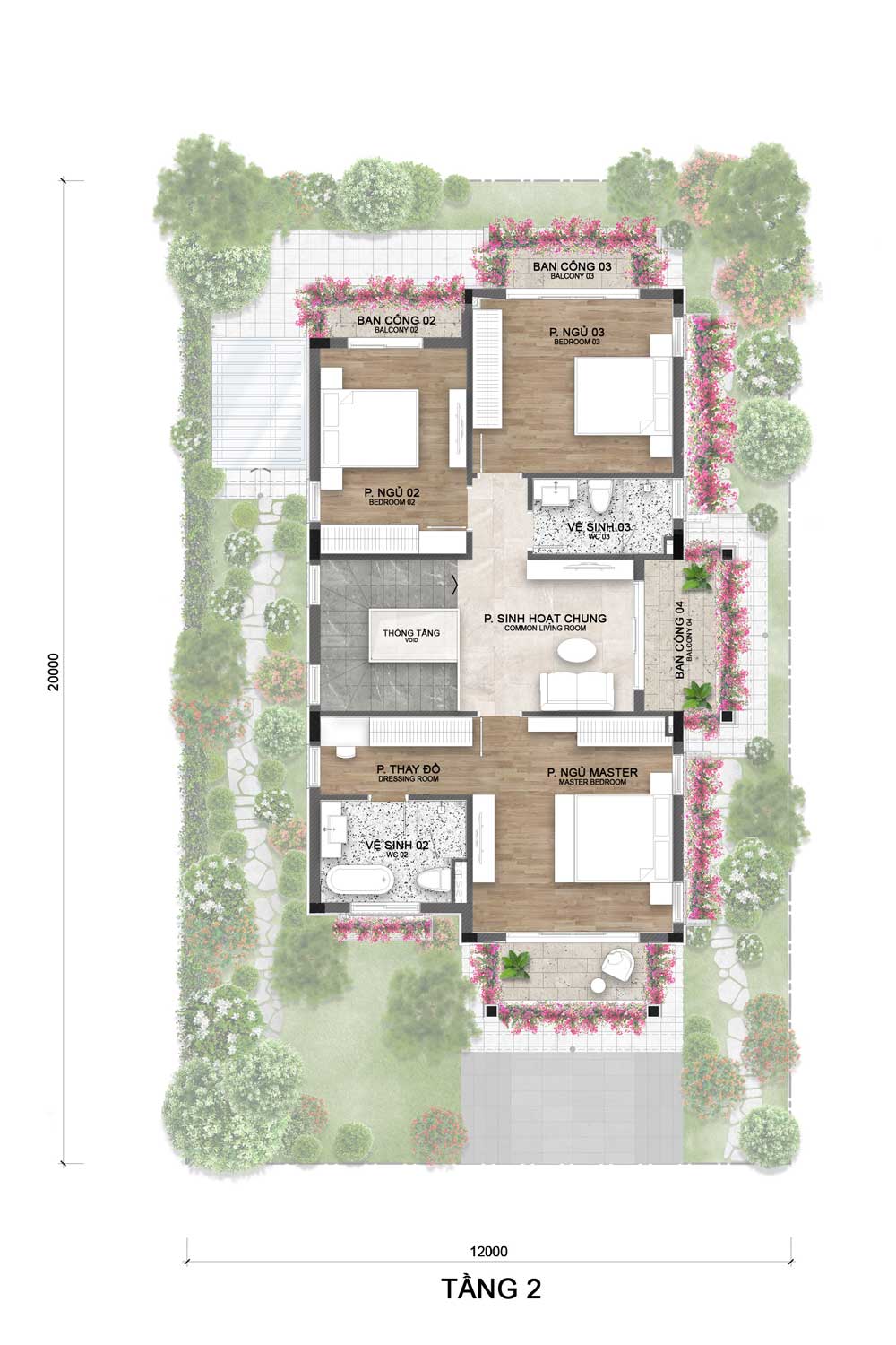 Bố trí 3 phòng ngủ thoáng sáng, trong đó phòng master có phòng thay đồ và vệ sinh riêng. Khu sinh hoạt chung đặt cạnh khoảng thông tầng giúp lấy sáng tự nhiên và tăng sự kết nối. Các phòng đều có ban công xanh mát, tạo không gian nghỉ ngơi thư giãn và riêng tư.