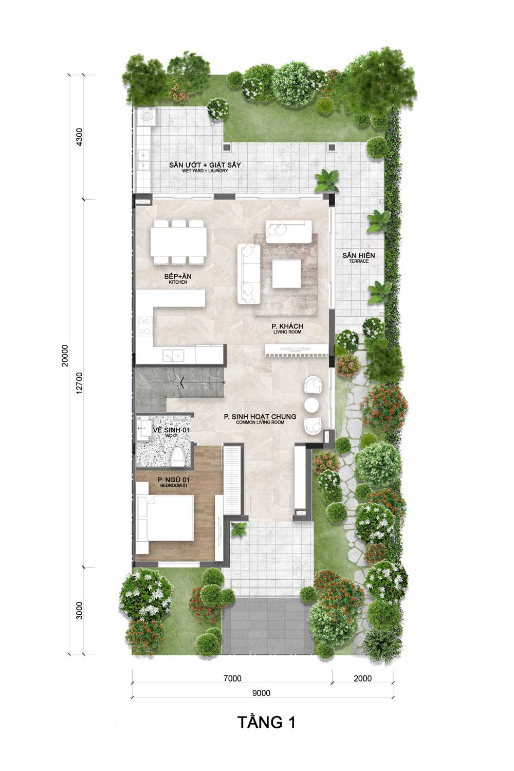 Được thiết kế mở với phòng khách trung tâm kết nối trực tiếp bếp + bàn ăn và sân hiên phía sau. Tầng này có 1 phòng ngủ, 1 vệ sinh chung và khu sân ướt riêng biệt. Không gian bao quanh là sân vườn xanh mát, tạo sự thông thoáng và gần gũi thiên nhiên.