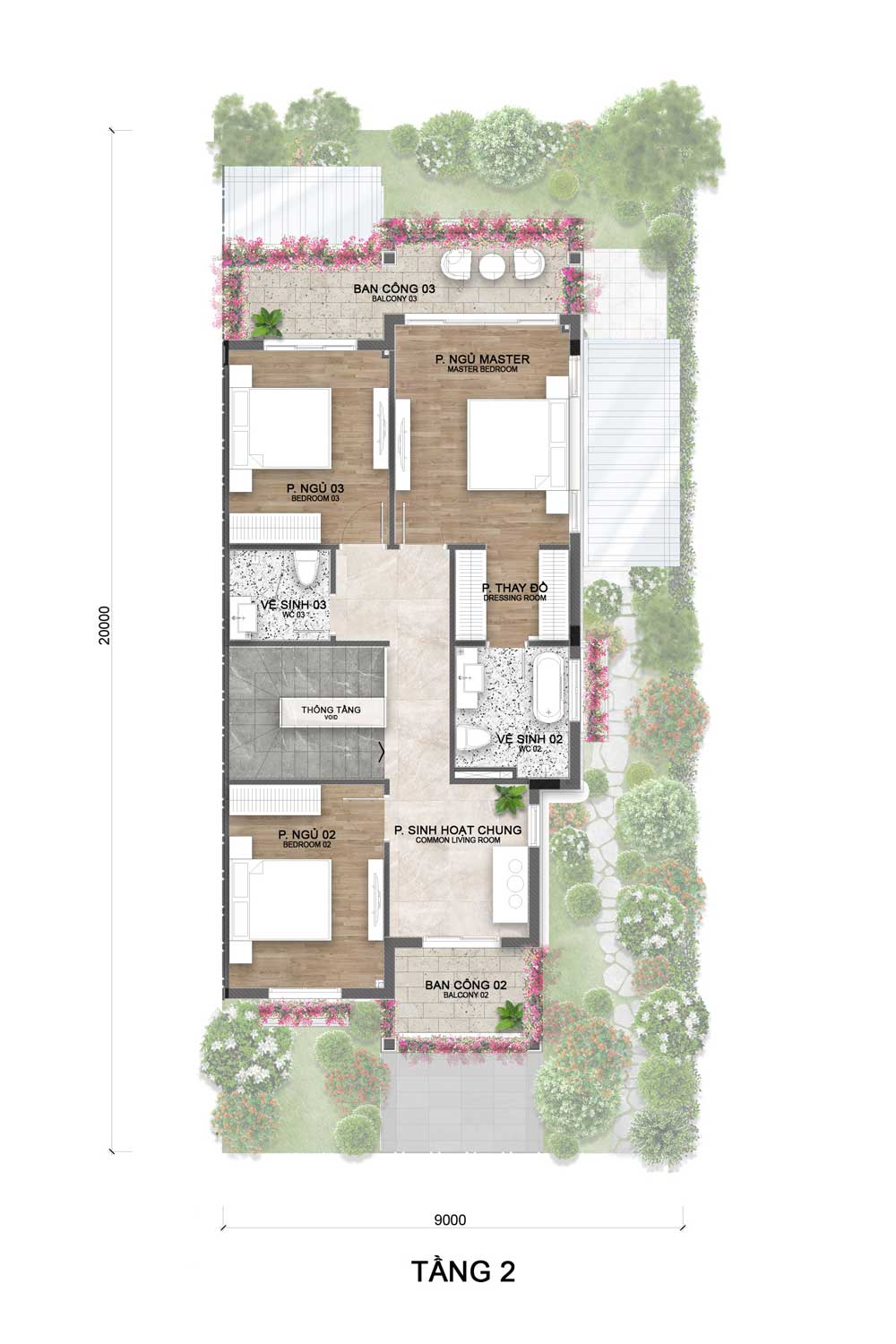 Bố trí 3 phòng ngủ thoáng sáng, trong đó phòng master có phòng thay đồ và vệ sinh riêng. Khu sinh hoạt chung đặt cạnh khoảng thông tầng giúp lấy sáng tự nhiên và tăng sự kết nối. Các phòng đều có ban công xanh mát, tạo không gian nghỉ ngơi thư giãn và riêng tư.