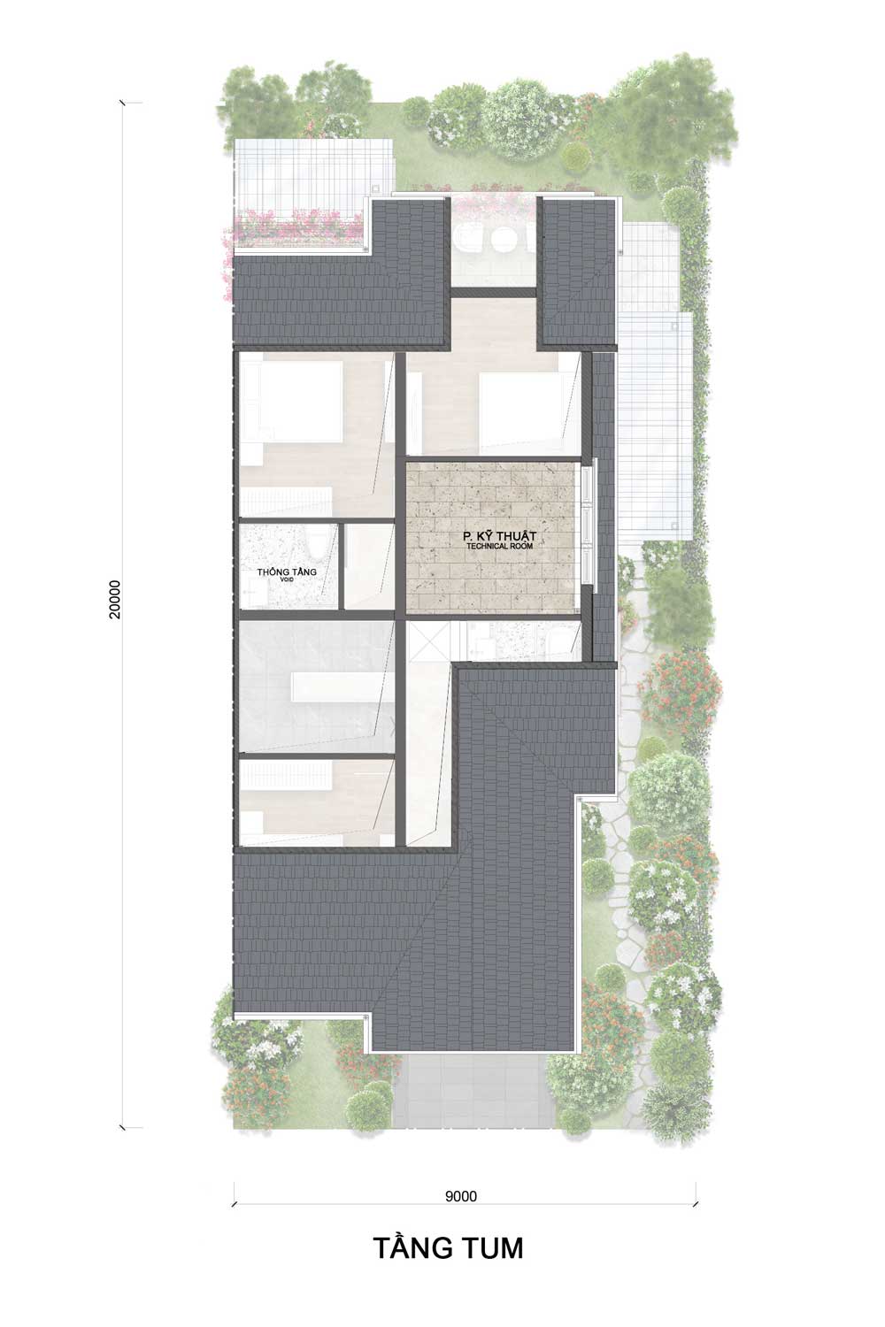 Bố trí phòng kỹ thuật và khu thông tầng ở trung tâm, đảm bảo thông gió và lấy sáng tự nhiên cho toàn bộ ngôi nhà. Phần mái dốc bao quanh tạo hình kiến trúc cân đối.