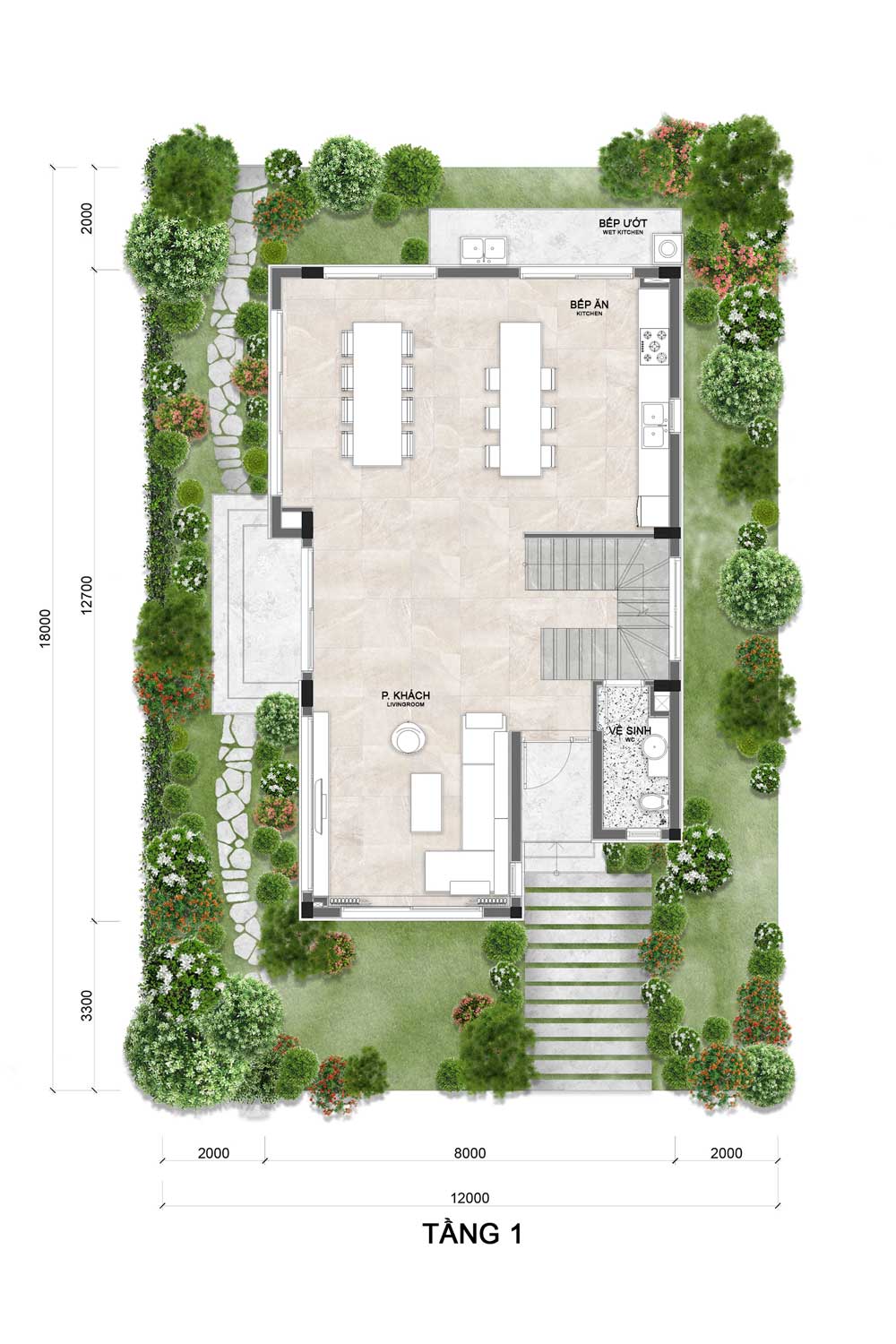 Thiết kế với không gian phòng khách rộng rãi kết nối liền mạch với khu bếp và phòng ăn, tạo sự thông thoáng và thuận tiện cho sinh hoạt chung. Phía sau là bếp ướt tách riêng giúp hạn chế mùi khi nấu nướng. Tầng này cũng bố trí 1 phòng vệ sinh cùng khu sân vườn xanh bao quanh, mang lại không gian sống gần gũi thiên nhiên.