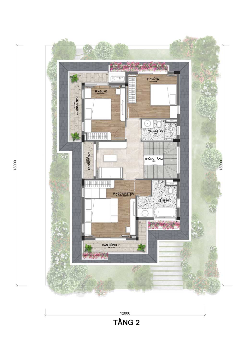 Bố trí 3 phòng ngủ gồm 1 phòng master có phòng vệ sinh riêng, cùng 2 phòng ngủ phụ dùng chung 1 phòng vệ sinh. Các phòng đều kết nối với ban công và khu thông tầng, giúp không gian luôn thông thoáng, đón ánh sáng tự nhiên và tạo sự riêng tư cho từng thành viên.