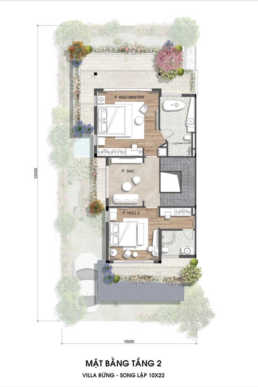 Gồm phòng ngủ master rộng rãi, thêm 1 phòng ngủ, phòng sinh hoạt chung ở trung tâm và 2 phòng tắm. Các phòng đều kết nối với ban công và sân vườn trên cao, tạo không gian nghỉ ngơi thoáng đãng.