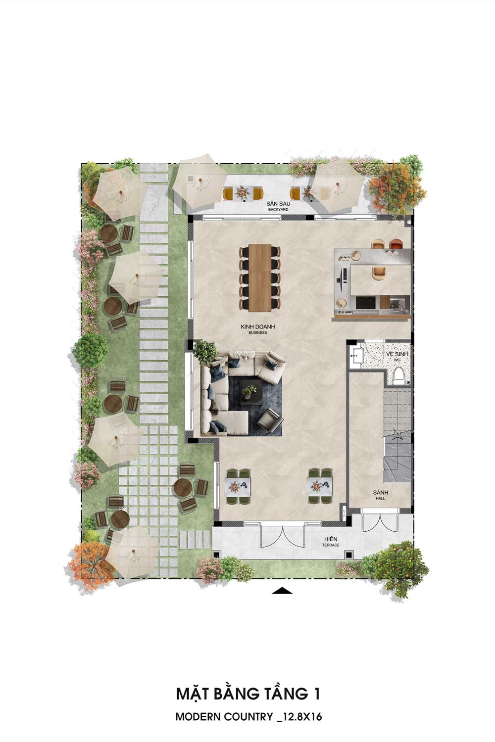 Bố trí không gian kinh doanh mở rộng rãi ở trung tâm, kết hợp khu bếp và quầy pha chế phía sau. Sảnh vào và cầu thang đặt bên phải, kèm WC tiện lợi. Bao quanh là hiên và sân vườn xanh mát với nhiều chỗ ngồi ngoài trời, tạo không gian thư giãn thoáng đãng và gần gũi thiên nhiên.