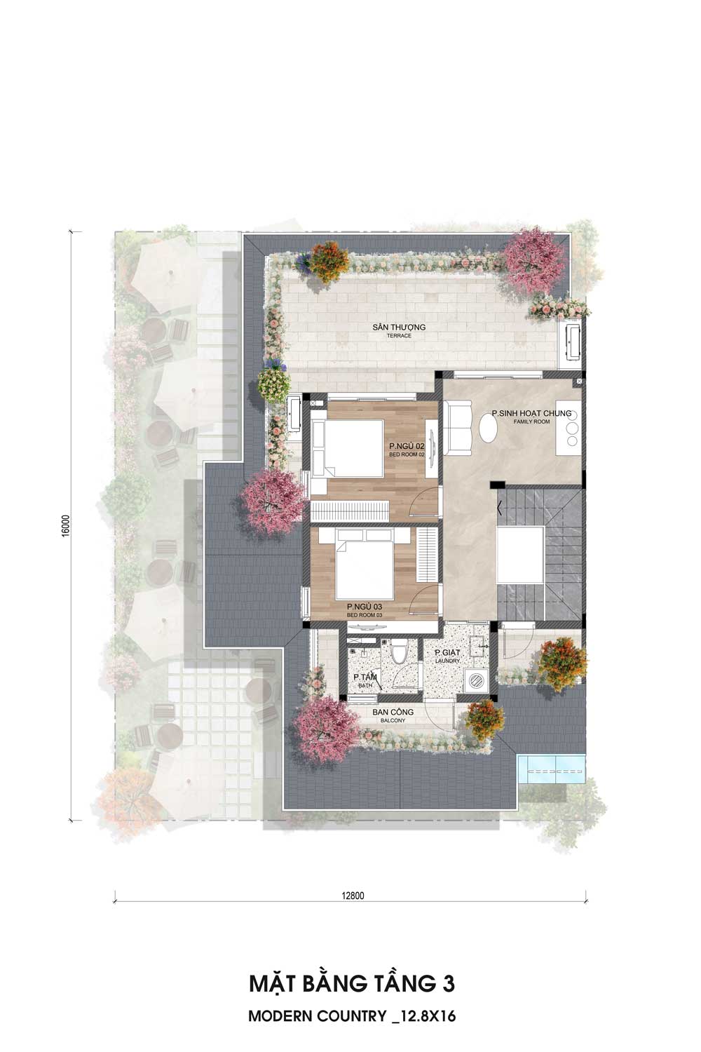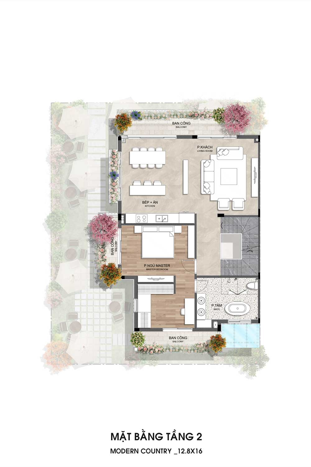 Gồm phòng khách rộng liên thông khu bếp – ăn, mở ra ban công thoáng mát. Phía trước là phòng ngủ master có phòng thay đồ riêng, kèm phòng tắm lớn tiện nghi. Cầu thang đặt bên hông, đảm bảo lưu thông thuận tiện và tách biệt không gian sinh hoạt.