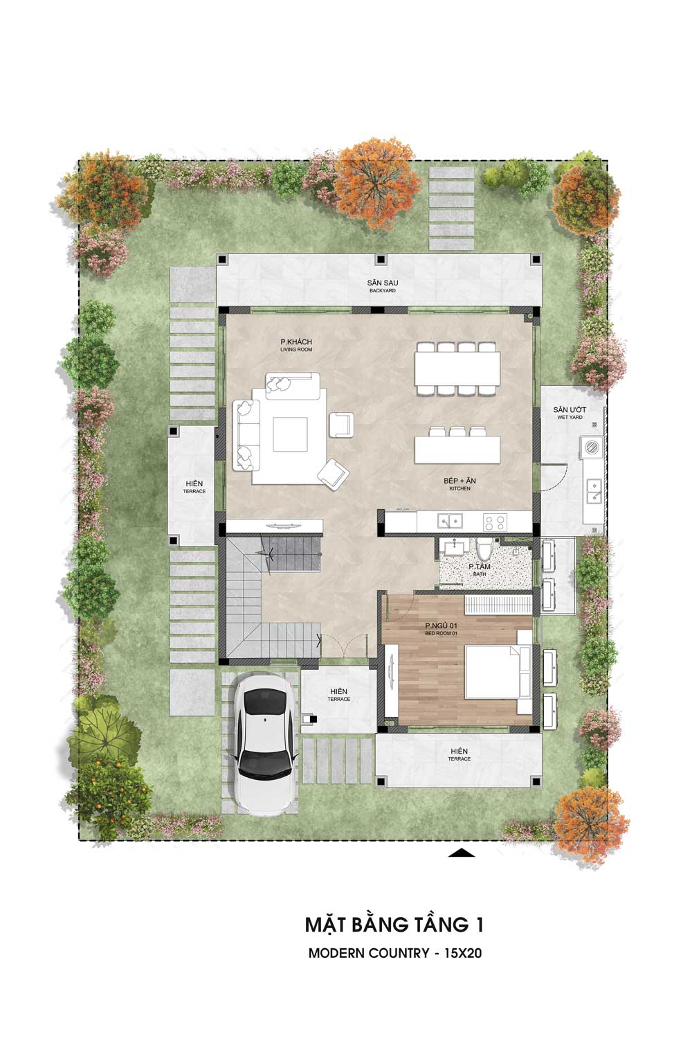 Thiết kế không gian mở với phòng khách liên thông bếp – ăn, kết nối trực tiếp sân sau rộng rãi. Bố trí 1 phòng ngủ, 1 phòng tắm và khu sân ướt tiện lợi. Xung quanh là hiên và sân vườn thoáng đãng, tạo môi trường sống gần gũi thiên nhiên.
