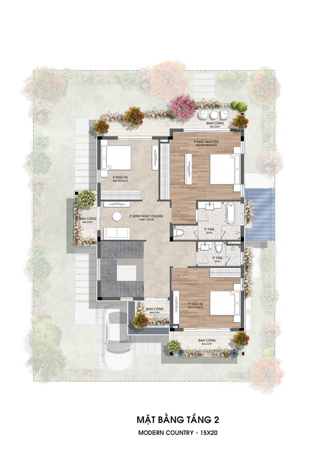 Gồm 3 phòng ngủ (trong đó có 1 phòng master), 2 phòng tắm và phòng sinh hoạt chung ở trung tâm. Các phòng đều có ban công thoáng đãng, đón sáng tự nhiên và tăng sự kết nối với không gian xanh bên ngoài.