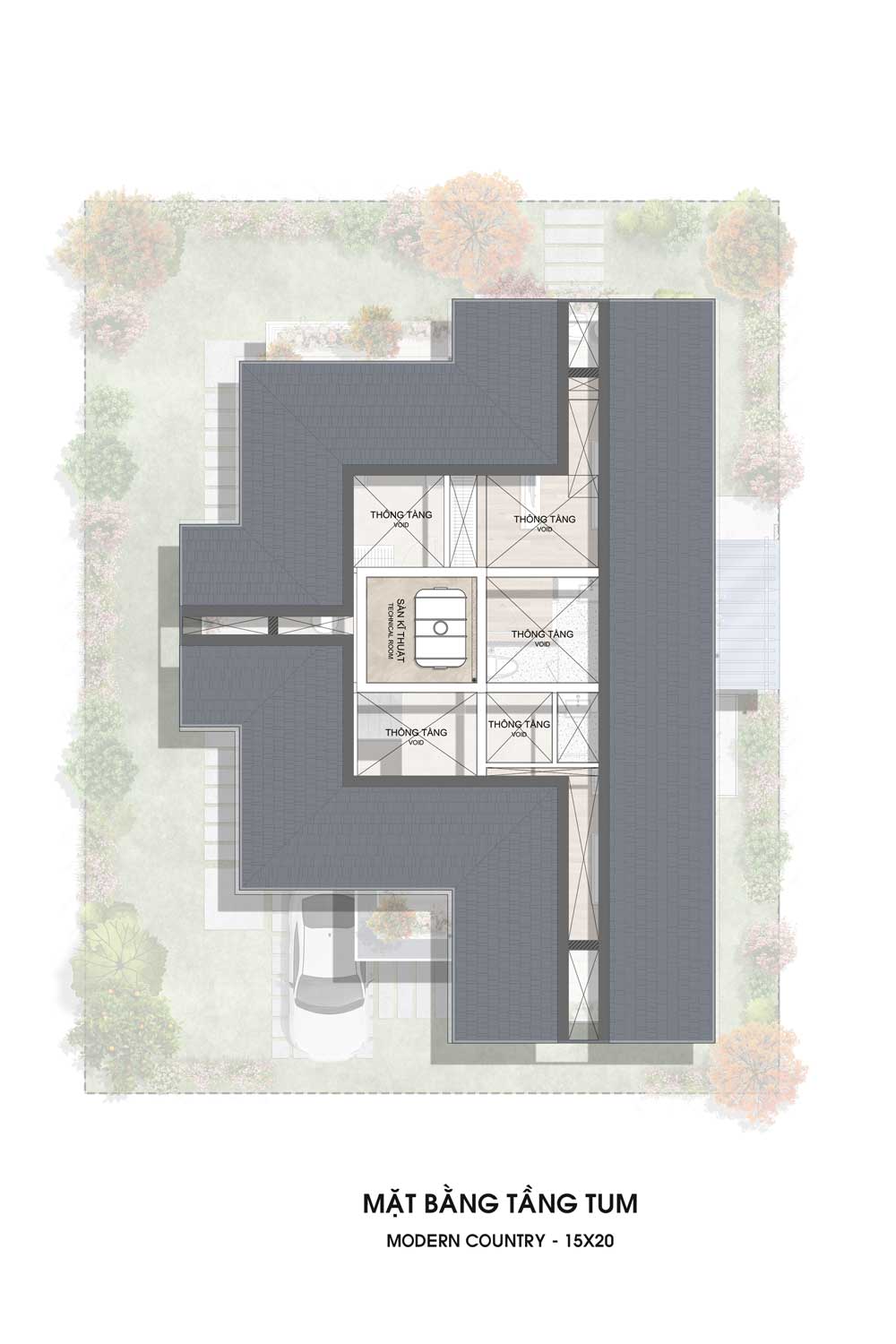 Bố trí phòng kỹ thuật và các khoảng thông tầng giúp lưu thông không khí, lấy sáng tự nhiên cho toàn bộ ngôi nhà.