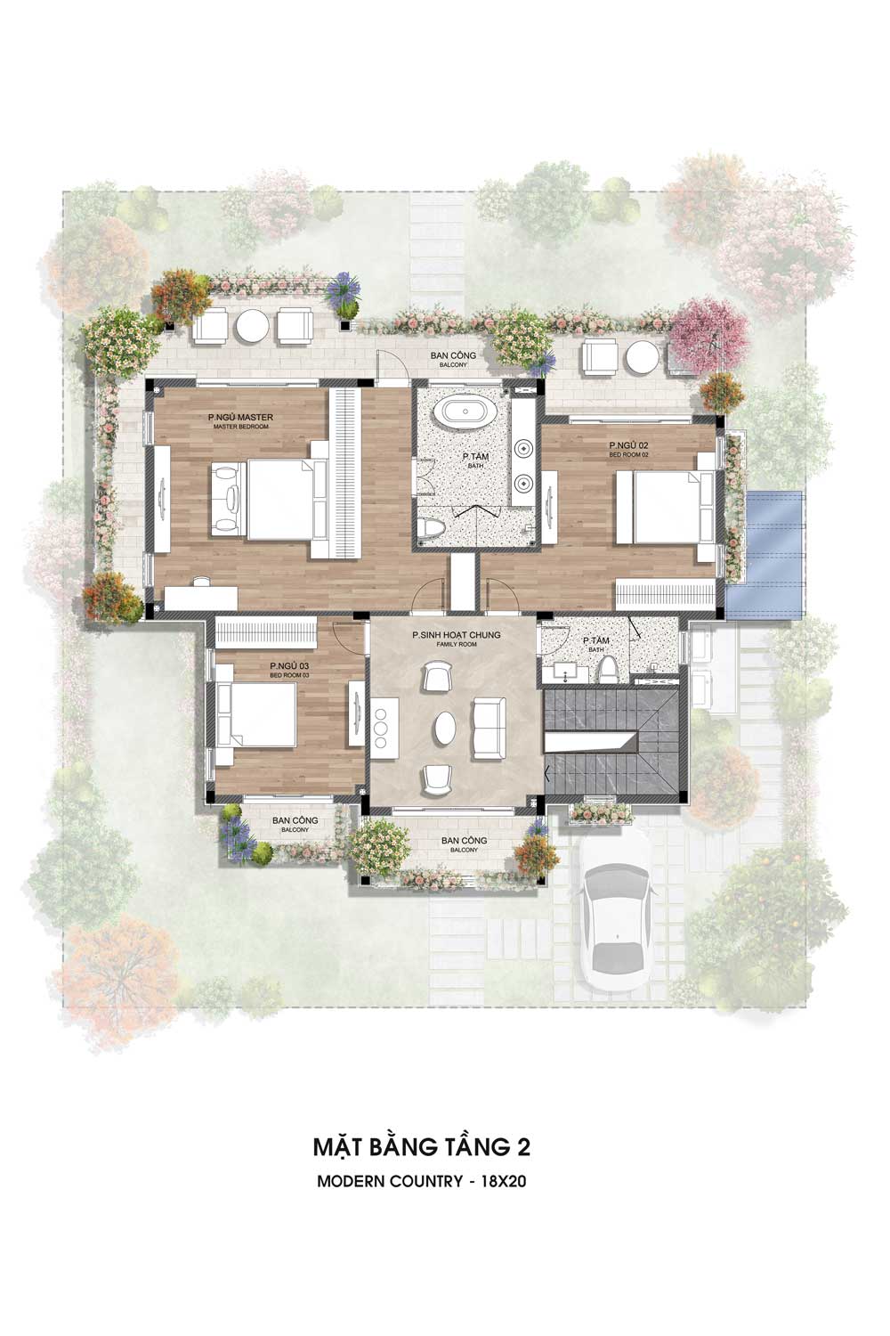 Bố trí phòng khách liên thông bếp – ăn trong không gian mở, kết nối trực tiếp hiên và sân vườn rộng bao quanh. Tầng này có 1 phòng ngủ, 1 phòng tắm, khu giặt sấy riêng và sảnh trung tâm, đảm bảo tiện nghi và thoáng sáng cho sinh hoạt hằng ngày.