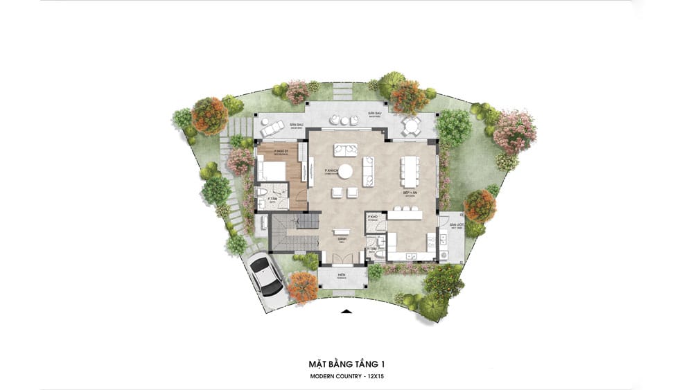 Thiết kế theo thế đất bo cong, bố trí phòng khách liên thông bếp – ăn ở trung tâm, mở rộng ra các khoảng sân vườn bao quanh. Tầng này có 1 phòng ngủ, 2 phòng tắm, khu sân sau và sân ướt riêng, đảm bảo tiện nghi và không gian sống gần gũi thiên nhiên.