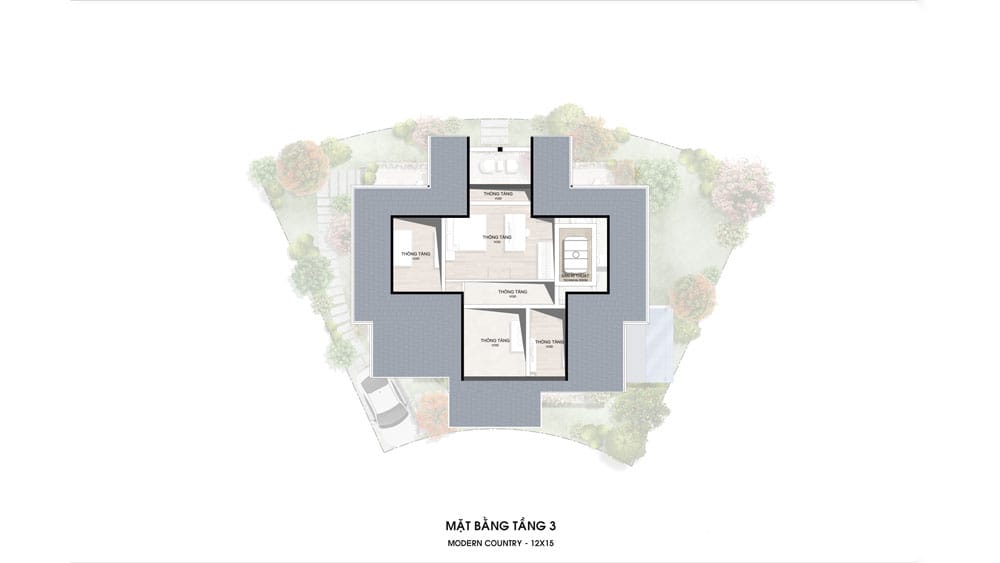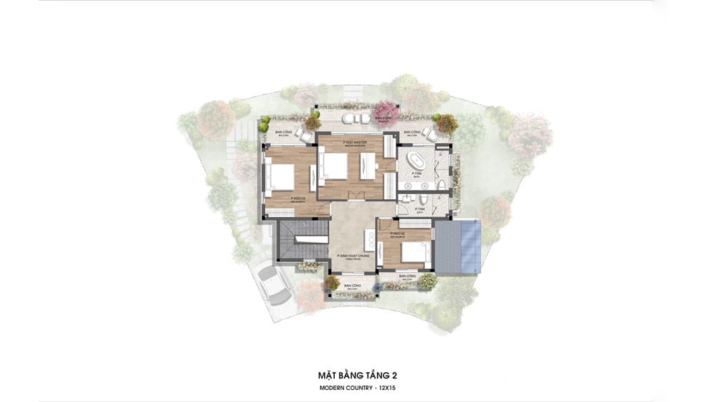 Bố trí 3 phòng ngủ (trong đó có 1 phòng master), 2 phòng tắm và phòng sinh hoạt chung ở trung tâm. Các phòng đều có ban công hướng vườn, tận dụng tối đa ánh sáng và tầm nhìn thoáng đãng theo thế đất bo cong.