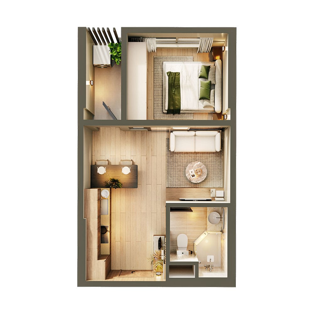 Căn hộ 1 phòng ngủ (1PN) là dòng sản phẩm được thiết kế với không gian sinh hoạt và phòng ngủ tách biệt rõ ràng, mang lại sự riêng tư và thoải mái hơn so với căn hộ studio. Khu vực phòng khách và bếp được bố trí riêng để tách biệt không gian, tăng tính thẩm mỹ, phòng ngủ khép kín tạo nên không gian nghỉ ngơi yên tĩnh và độc lập.