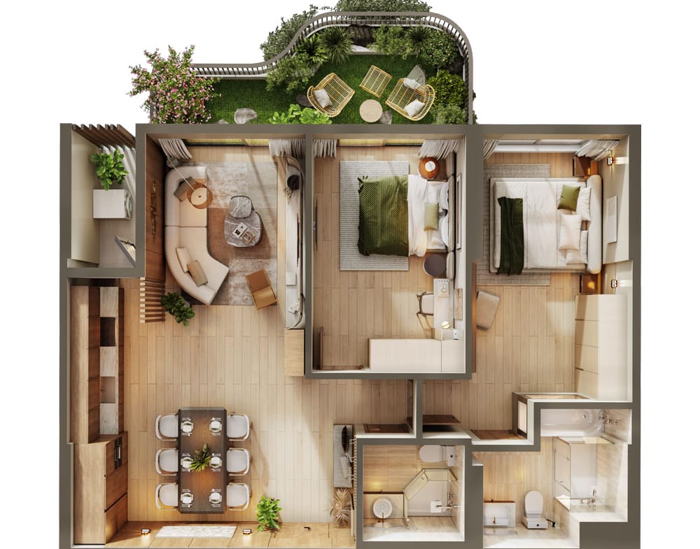 Căn hộ 2 phòng ngủ (2PN) được thiết kế đặc biệt với từng khu vực chức năng tách biệt rõ ràng, bao gồm phòng khách, bếp, hai phòng tắm và hai phòng ngủ riêng, mang lại sự riêng tư và tiện nghi trọn vẹn cho các thành viên trong gia đình. Cách bố trí khoa học giúp tận dụng tối đa diện tích nhưng vẫn giữ được cảm giác rộng rãi, dễ chịu khi sinh hoạt. Điểm nhấn của thiết kế là ban công rộng mở hướng về không gian retreat xanh mát – nơi lý tưởng để thư giãn, thưởng thức tách cà phê buổi sáng hay ly đồ uống quen thuộc dưới ánh nắng dịu nhẹ và làn gió thổi thoáng qua. Phù hợp cho gia đình có con nhỏ hoặc người cần thêm không gian làm việc tại nhà, căn hộ 2PN cũng là phương án đầu tư bền vững nhờ tệp khách thuê ổn định và tiềm năng khai thác lâu dài.