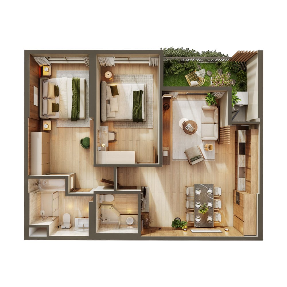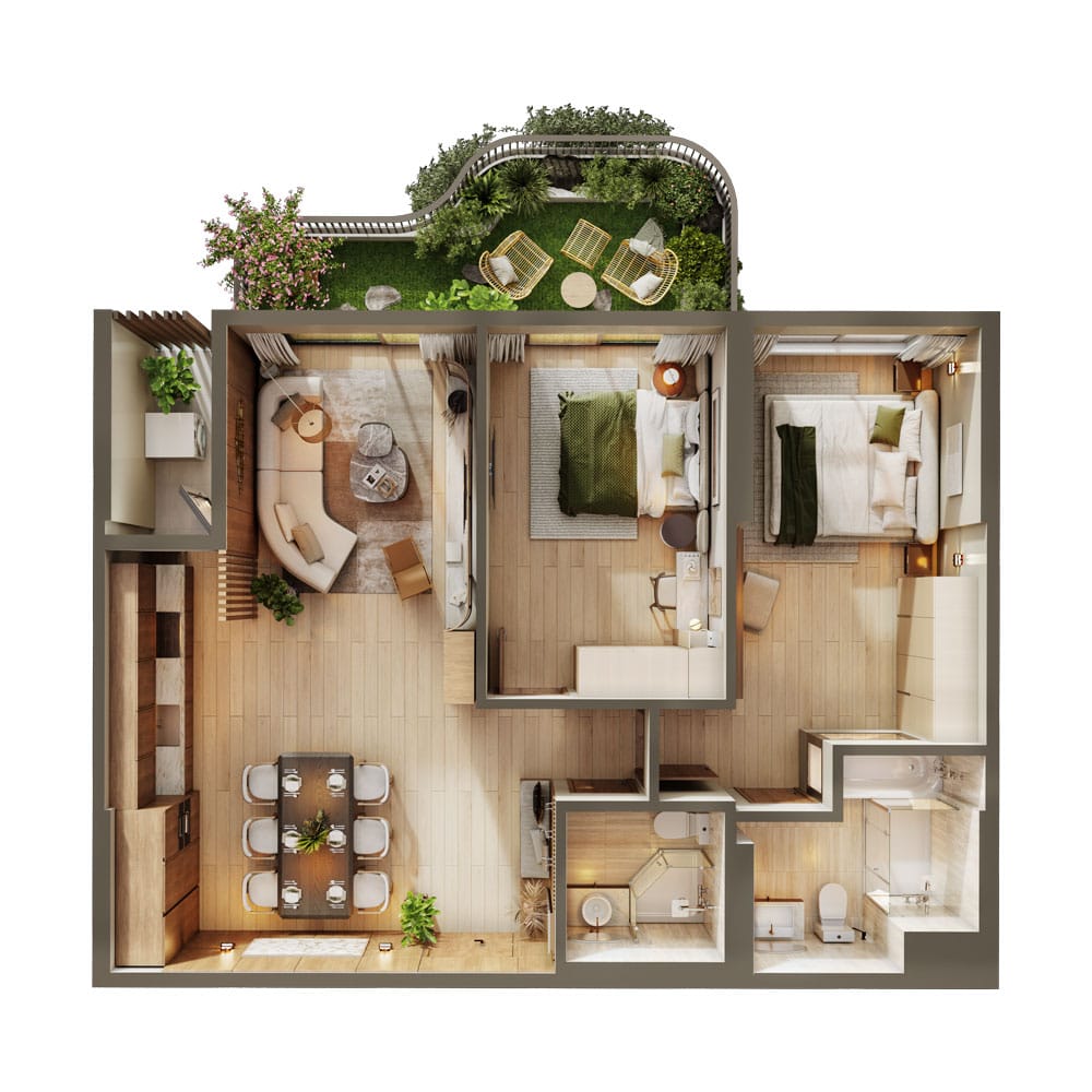 Căn hộ 2 phòng ngủ (2PN) được thiết kế đặc biệt với từng khu vực chức năng tách biệt rõ ràng, bao gồm phòng khách, bếp, hai phòng tắm và hai phòng ngủ riêng, mang lại sự riêng tư và tiện nghi trọn vẹn cho các thành viên trong gia đình. Cách bố trí khoa học giúp tận dụng tối đa diện tích nhưng vẫn giữ được cảm giác rộng rãi, dễ chịu khi sinh hoạt. Điểm nhấn của thiết kế là ban công rộng mở hướng về không gian retreat xanh mát – nơi lý tưởng để thư giãn, thưởng thức tách cà phê buổi sáng hay ly đồ uống quen thuộc dưới ánh nắng dịu nhẹ và làn gió thổi thoáng qua. Phù hợp cho gia đình có con nhỏ hoặc người cần thêm không gian làm việc tại nhà, căn hộ 2PN cũng là phương án đầu tư bền vững nhờ tệp khách thuê ổn định và tiềm năng khai thác lâu dài.