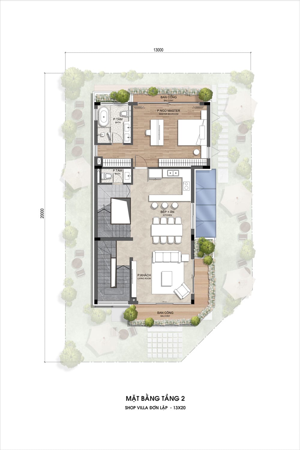 Được bố trí như tầng sinh hoạt chính với không gian rộng rãi và riêng tư. Phòng khách nằm phía trước, mở ra ban công lớn bao quanh, tạo tầm nhìn thoáng đãng và đón trọn ánh sáng tự nhiên. Khu bếp và bàn ăn thiết kế liên thông ở trung tâm, tối ưu sự kết nối giữa các thành viên trong gia đình. Phía sau là phòng ngủ master rộng rãi, có ban công và phòng tắm riêng tư tiện nghi. Cầu thang và WC phụ đặt ở góc, đảm bảo lưu thông thuận tiện.